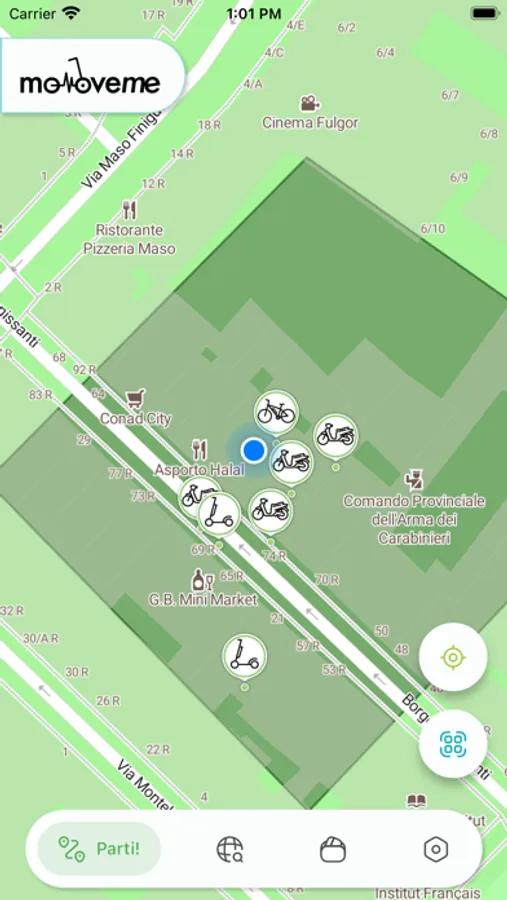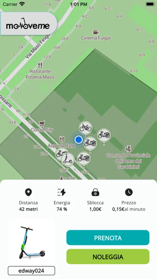 1) Open the app to view the map and find the Mooveme electric vehicles closest to you.