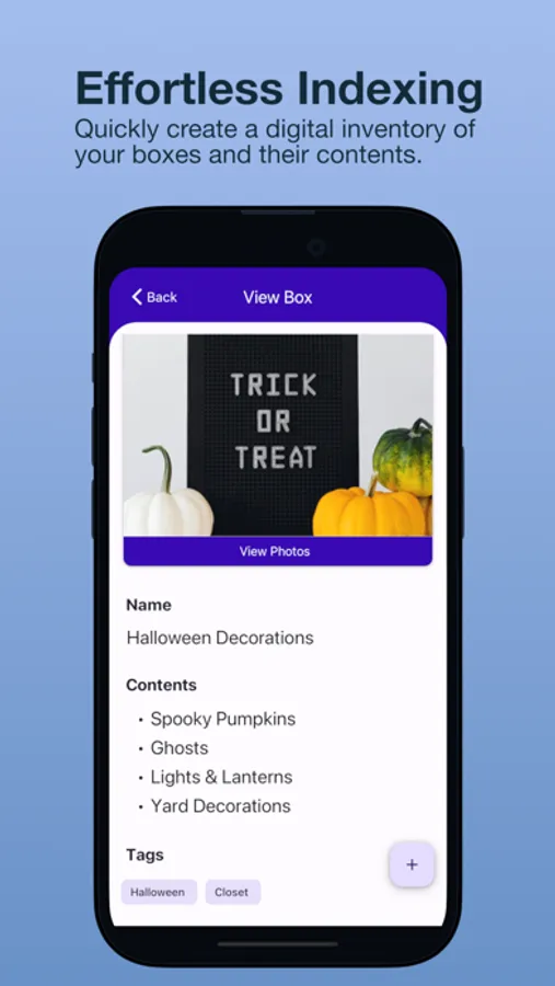 • Effortless Box Indexing: Quickly create a digital inventory of your boxes and their contents. Say goodbye to manual lists and messy handwriting.