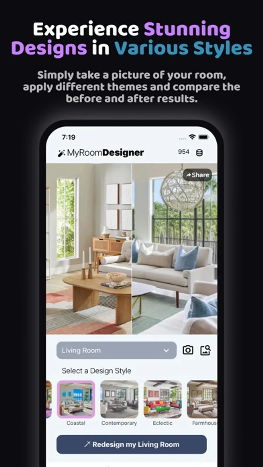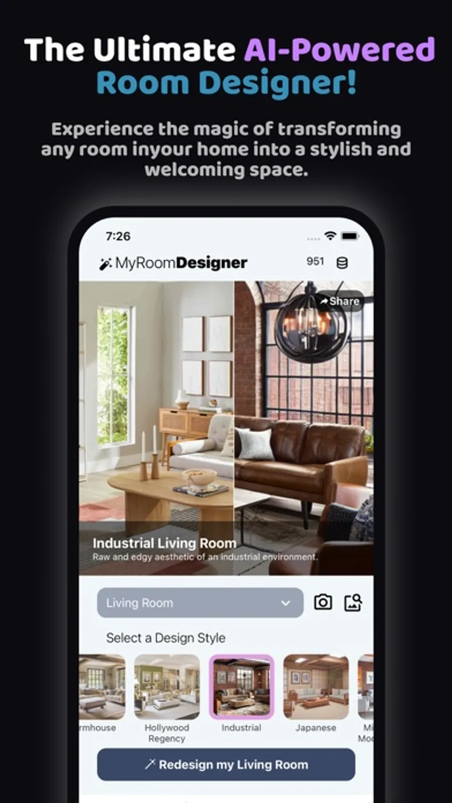 Just take a photo of your room, upload it to the MyRoomDesigner app, and choose your preferred theme. Then, sit back and let our AI work its magic.