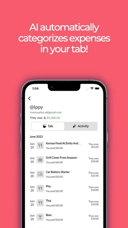 - AI-Powered Expense Splitting: Add your expenses to the "Tab" and let our AI take over! It automatically categorizes your expenses and calculates the split, so you don't have to.