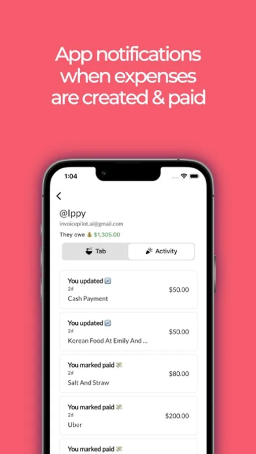 - Automatic Notifications: When it's time to settle the "Tab", OpenTab will send a friendly reminder to the people who owe money. No more awkward conversations or IOUs!