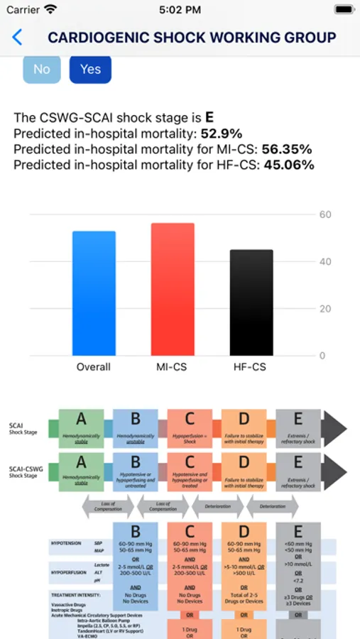 The first page of the app features the Cardiogenic Shock Working Group Shock Stage Calculator. This calculator utilizes the CSWG-SCAI shock stage classification system to determine the severity of cardiogenic shock. It provides an accurate assessment of the shock stage, along with the predicted mortality rate for each stage. Additionally, the calculator presents separate mortality predictions for myocardial infarction-related cardiogenic shock (MI-CS) and heart failure-related cardiogenic shock (HF-CS). Furthermore, it offers a predicted probability of stage escalation.