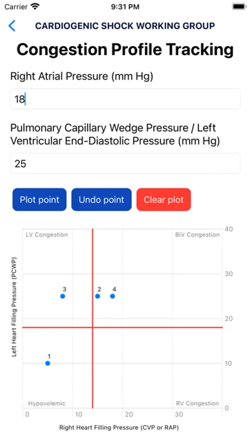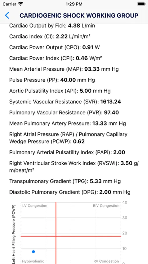 The second page of the app houses the Invasive Hemodynamics Calculator. This powerful tool enables healthcare professionals to calculate various important parameters related to hemodynamics. With this calculator, users can determine parameters such as cardiac output using the Fick method, cardiac index, cardiac power output, cardiac power index, pulse pressure, aortic pulsatility index, systemic vascular resistance, mean pulmonary artery pressure, right atrial pressure/pulmonary capillary wedge pressure, pulmonary artery pulsatility index, right ventricular stroke work index, transpulmonary gradient, and diastolic pulmonary gradient. Additionally, the calculator generates a graph that plots left heart filling pressure (PCWP) and right heart filling pressure (CVP or RAP) to aid in the classification of parameters into categories such as "LV congestion," "RV congestion," "Hypovolemic," and "BiV Congestion."