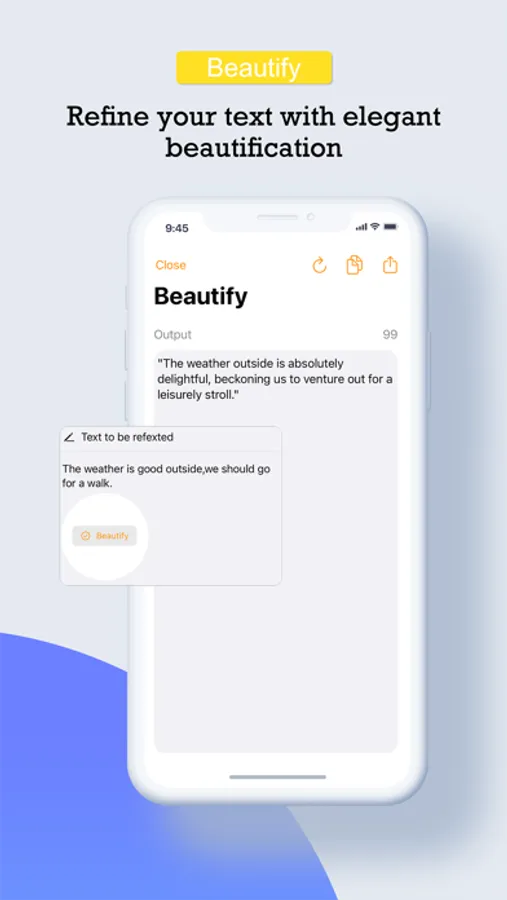 Elevate your text to new heights with Refext's "Beautify" feature. By leveraging the power of GPT models, this feature goes beyond grammar and offers intelligent suggestions to improve the flow, clarity, and coherence of your writing. It helps you transform your ideas into eloquent prose effortlessly.