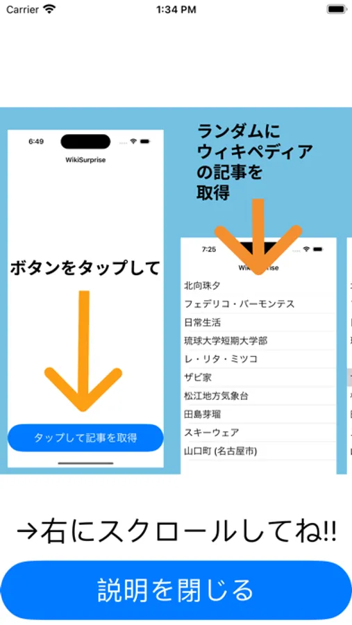 毎回ランダムに選ばれた10個のWikipediaの記事タイトルを提供します。自分が普段興味を持つことがないようなテーマについて、新しい知識や視点を発見するチャンスです。タイトルをタップすればその記事へ直接飛び、詳細を読むことができます。