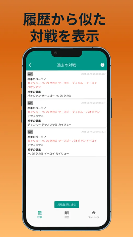 似たパーティの検索: 入力した対戦相手のパーティと似たパーティとの対戦記録を過去の対戦記録から検索します。これにより、過去の対戦を次の戦略に活かすことが可能です。