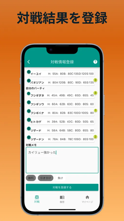 対戦メモ: 対戦後に自分と相手の選出順や戦略、そして今後の改善点などを詳細に記録することができます。