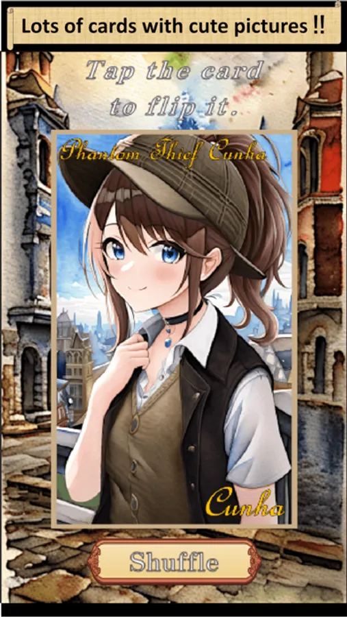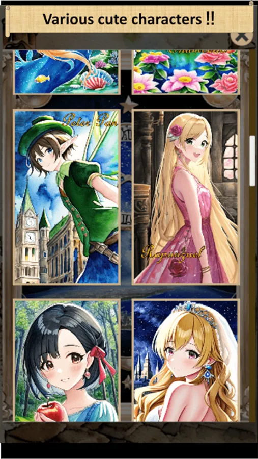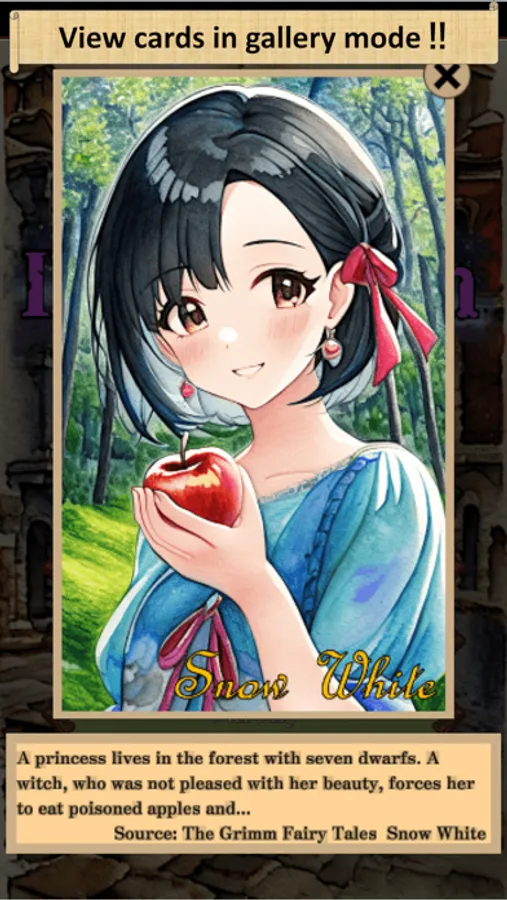 Flip the cards illustrated with characters from various works, such as Red Riding Hood and Snow White!