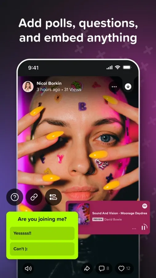 Stories can include text, photos, videos, GIFs, quizzes and links but also YouTube videos, songs and playlists from Spotify, TikTok videos, Google Maps and basically any site that allows embedding of their content. Stories can be one page or multiple pages.