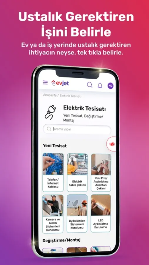 Tesisat kurulumu, montaj-değiştirme ve arıza çözümlerinde Türkiye'nin önde gelen ev hizmetleri platformu Evjet ile sorunlarınız artık geçmişte kalacak. İşinin ehli ve güvenilir ustalarımızdan elektrik tesisatı, sıhhi tesisat, enerji sistemleri, ısıtma sistemleri, basit tamirat ve montaj çözümleri gibi çeşitli kategorilerde tek tıkla hizmet alabilirsiniz.