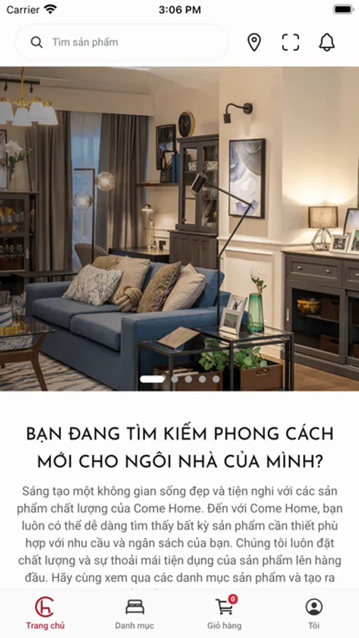 COME HOME tự hào là điểm đến “One-Stop Shopping” đầu tiên của nhịp sống hiện đại tại Việt Nam, nơi cung cấp nhiều sản phẩm nội thất được thiết kế độc quyền, chất lượng quốc tế với giá cả phải chăng với 3 nhóm phong cách: Hiện đại tối giản, Hiện đại quốc tế, Truyền thống Việt Nam.
