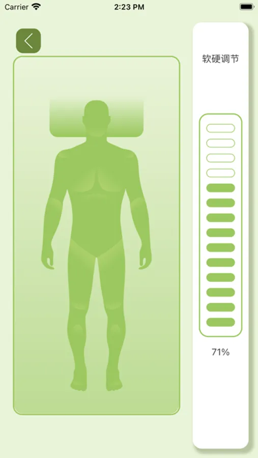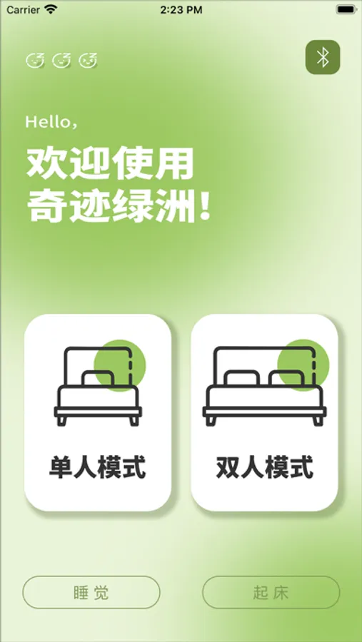 使用App时需要进行蓝牙连接,即开启手机蓝牙,打开App后在右上角选择产品蓝牙进行连接,连接后可进行单/双人模式、睡眠/起床模式、整体软硬调节或左右分区的独立软硬调节。