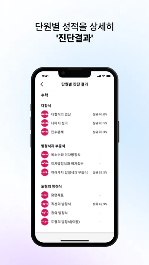 - 진단한 문제들의 결과를 과목별, 단원별로 세분화시켜 과목, 단원 별로 전국 성적, 교내 성적을 확인하고, 이를 통해 나의 학습 목표와 뱡항을 보다 더 뚜렷하게 설정할 수 있습니다.