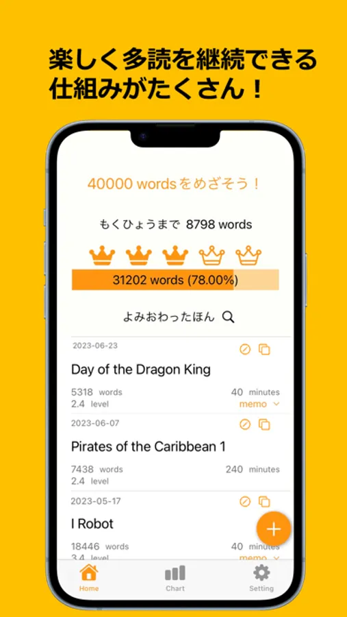 読んだ本の語数、レベル、タイトル、読破した日、読書時間、メモを記録することができます。