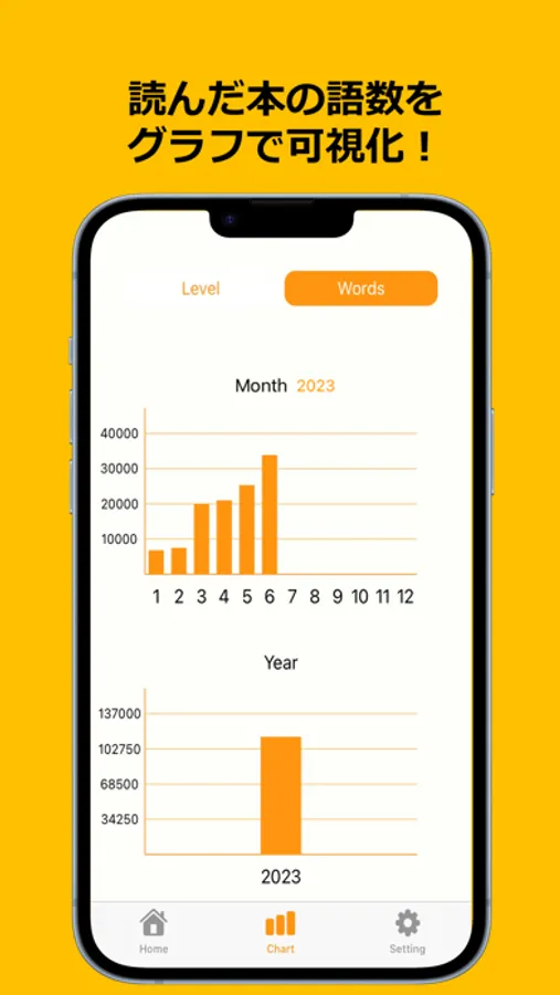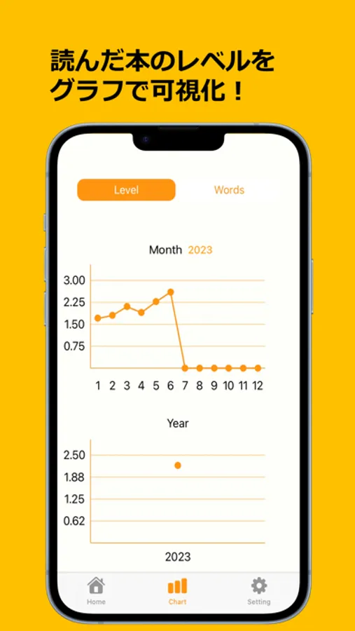 読んだ本のレベルと語数を、月・年で可視化し、グラフで見ることができます。