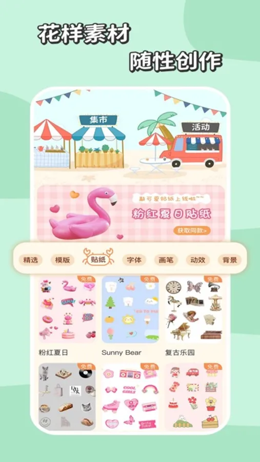 【更丰富的创作素材】各种风格的贴纸、背景、画笔、手帐模板等素材,持续更新,免费使用!