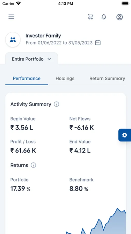 - Return Summary: Entire Portfolio level, IRR or TWRR return can be monitored for pre-defined period, selected period or since inception of family, Individual (all channel/by channel) or Accounts lying under that group.