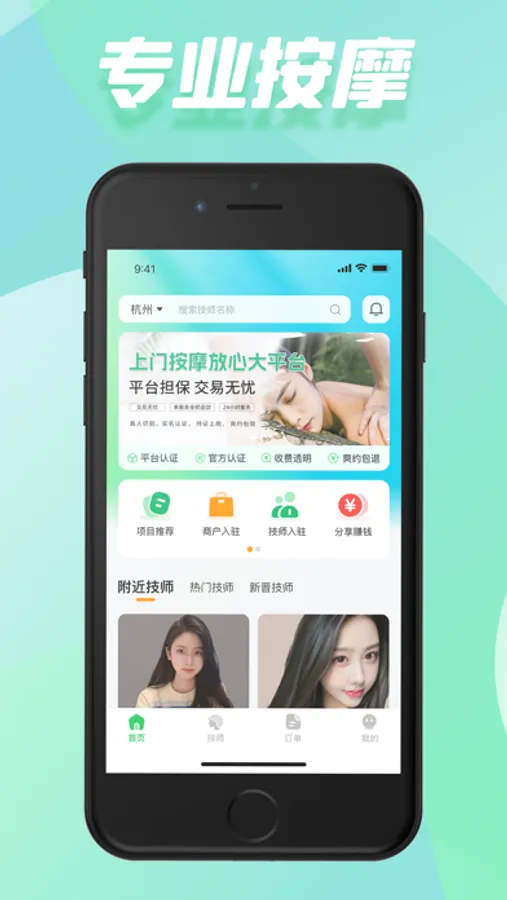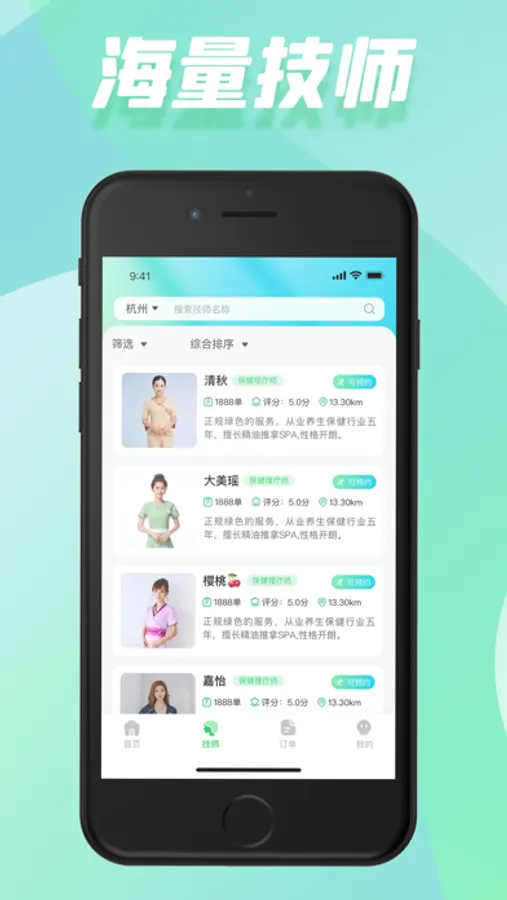 2、附近技师:附近技师服务项目一目了然,预约技师上门按摩