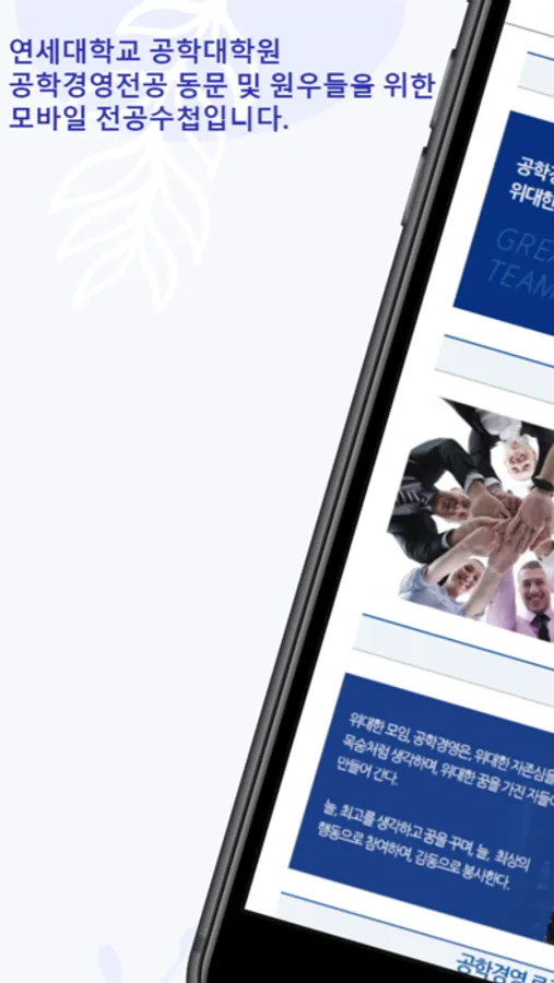 연세대학교 공학대학원 공학경영전공 동문,원우 및 교수진 정보와 전공에 관한 소식을 열람할 수 있는 모바일 전공 수첩 어플리케이션입니다.