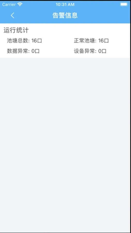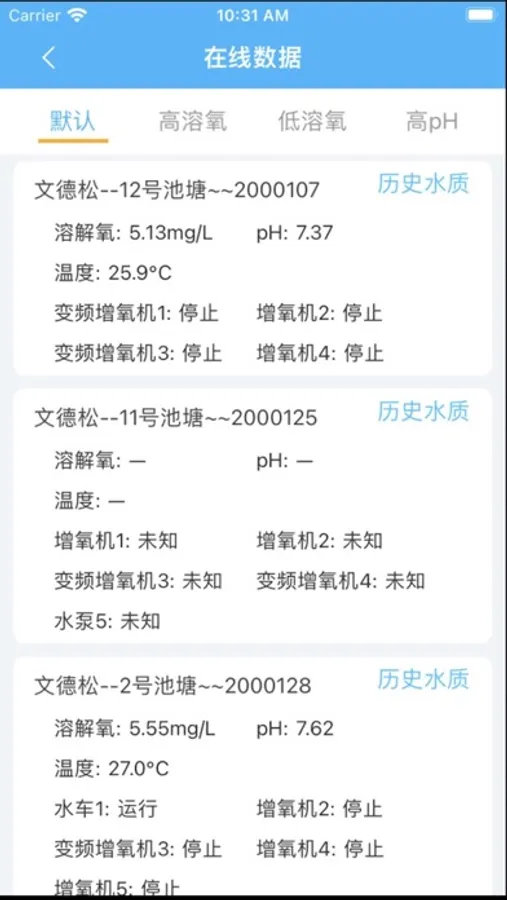 3.在线数据按钮点进去是当前业务员下用户的池塘的基本水质信息, 上面有排序选择, 可以根据条件选择界面显示;