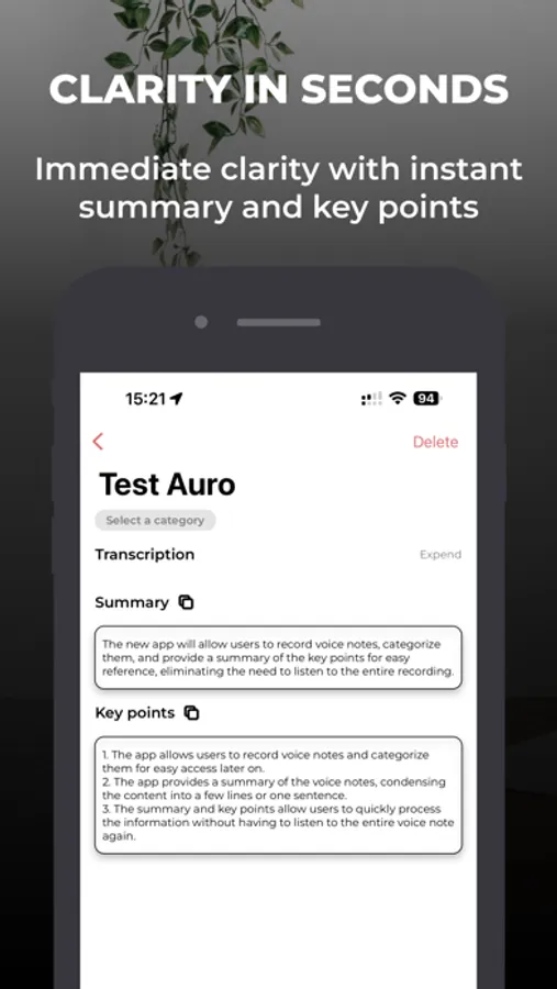 Need a quick summary? Auro generates key points from your recordings, helping you stay on top of your thoughts.