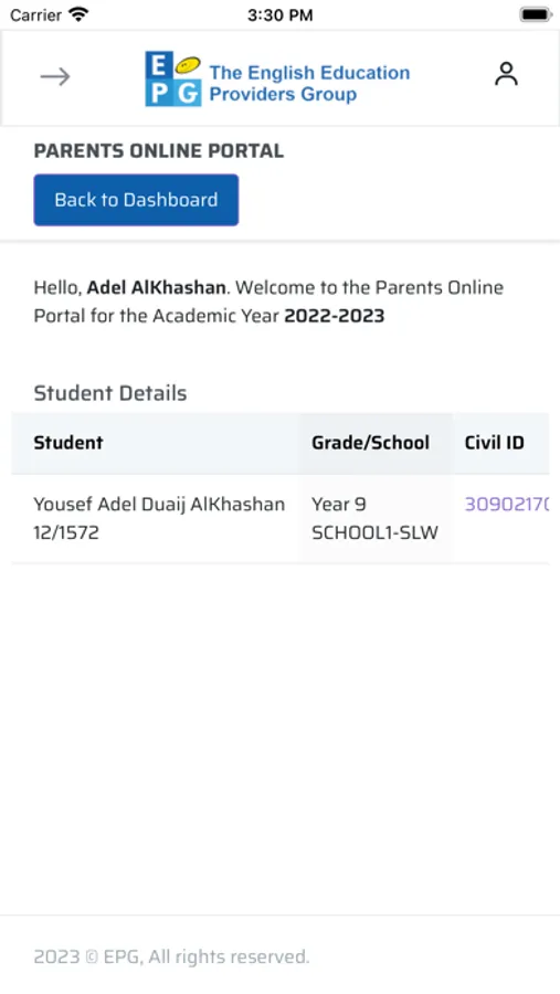 The EPG Parent Portal is an app of "The English Education Providers Group", that allows parents to log into the Parents Portal only through pre-registered login and password. The portal allows parents to pay the school fees of their children through multiple payment options such as KNet, Credit Cards, etc. and receive notifications through SMS.