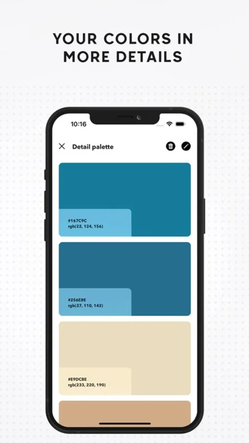 With ColorsScan, each saved color can be explored in detail. Our app provides you not only with the hexadecimal code, but also the RGB (Red, Green, Blue) values of every color you have selected. This allows you to reproduce these colors with extreme precision in your future projects, be it in digital design or painting. By providing these details, ColorsScan does more than just identify colors - it gives you a powerful tool to understand and use colors in their full complexity and beauty.