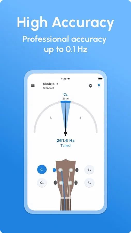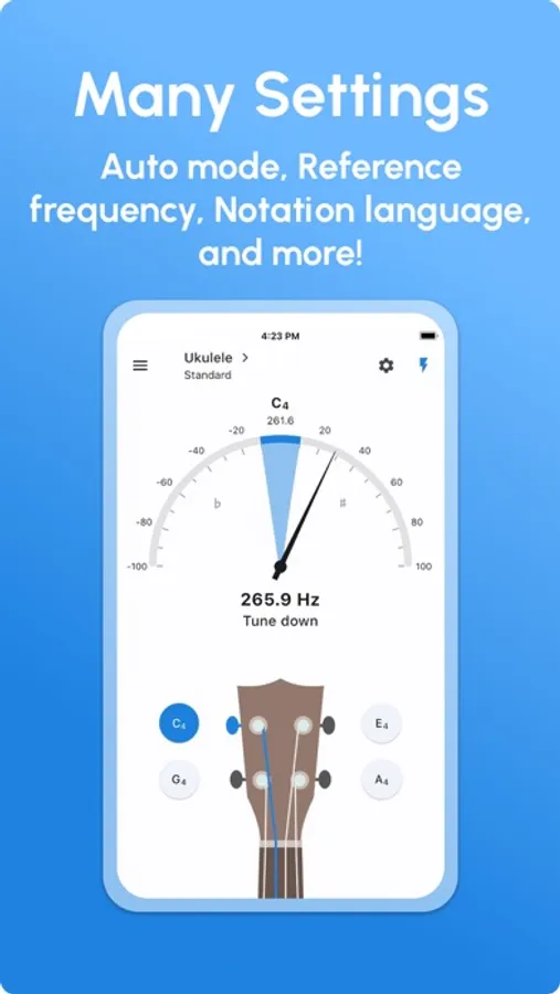 Tune the ukulele faster with the automatic mode. You can play any note, and we will properly detect it to give you hints on how to tune a ukulele.