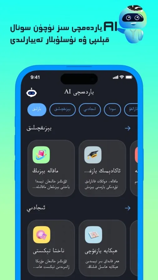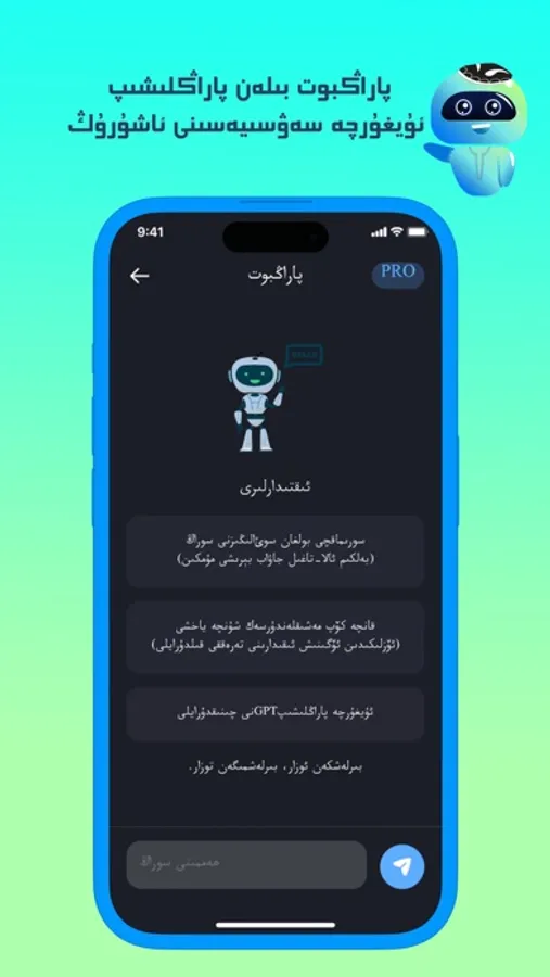 چەت ج پ ت نىڭ بارلىق ئىقتىدارى مۇجەسسەملەشتۈرۈلگەن، ئۇيغۇرچە قېلىپ قولايلىقلاشتۇرۇلغان كۆرۈنمە يۈزى ۋە سورايدىغان سوئال قېلىپ ۋە كاتىگورىيەسى سىزنى پاراڭبوت بىلەن پاراڭلىششىڭىزنى ئاسانلاشتۇرىدۇ،