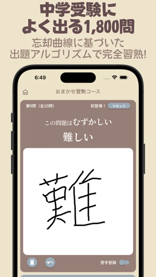 中学受験によく出る漢字問題1,800問を忘却曲線に基づいた独自の出題アルゴリズムでスピーディに繰り返し学習することができます。