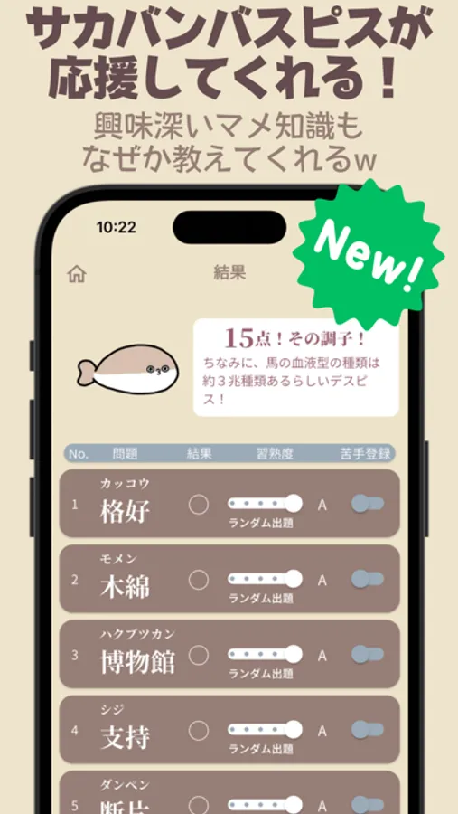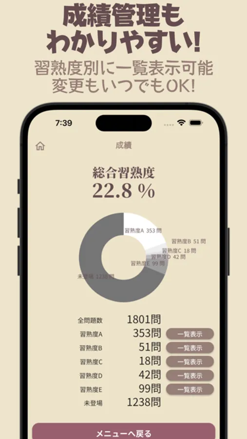 (不正解の問題は、1日後に出題され、そこで正解すると3日後、次に正解すると・・・のように、忘却曲線理論を基にした出題アルゴリズムを採用しています。)