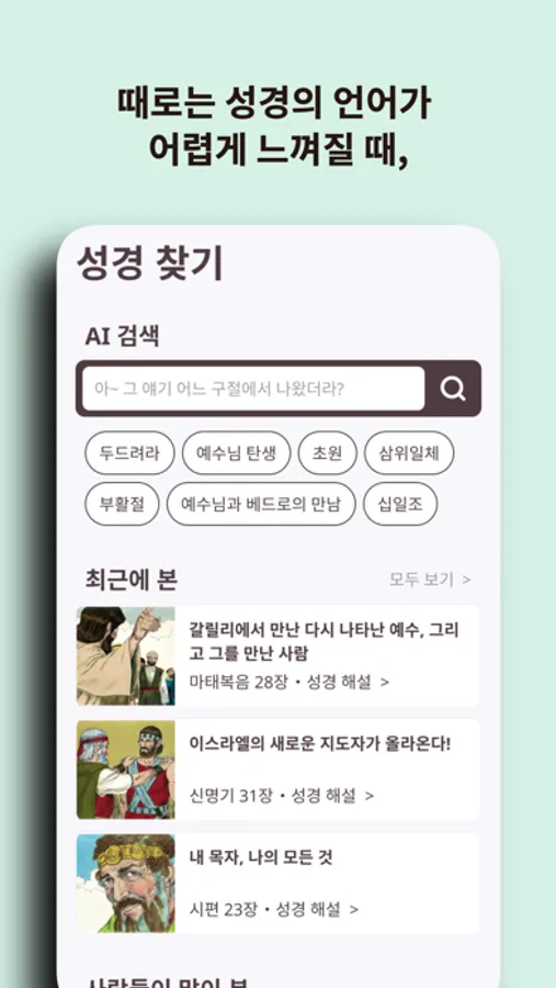 때로는 성경의 언어가 낯설고 복잡하게 느껴질 수 있습니다. 초원의 성경 해설이 당신의 곁에서 길잡이가 되어드립니다. 성경의 각 장과 절에 대한 명쾌한 해석을 통해, 하나님의 말씀을 더욱 쉽고 깊게 이해할 수 있습니다.