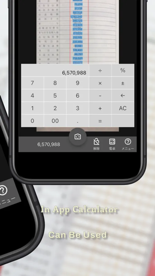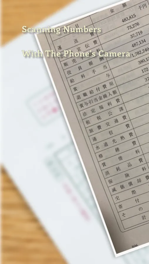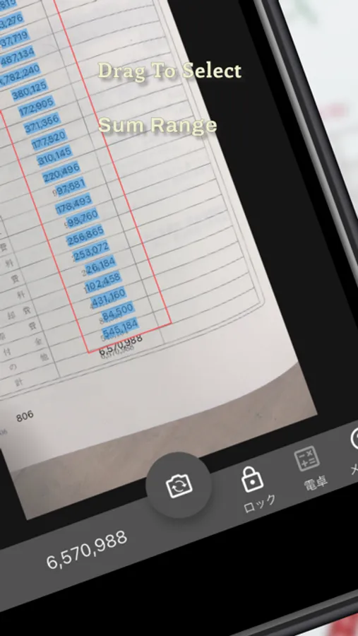 This application uses the smartphone's camera to recognize numbers and automatically calculate totals. After scanning, you can specify the range of the total by dragging on the screen.