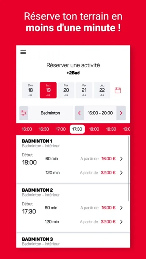 Fini la corvée de réservation ! Avec l'application tu n'as plus qu'à accéder aux créneaux disponibles et à en choisir un. Le club recevra alors automatiquement ta réservation.