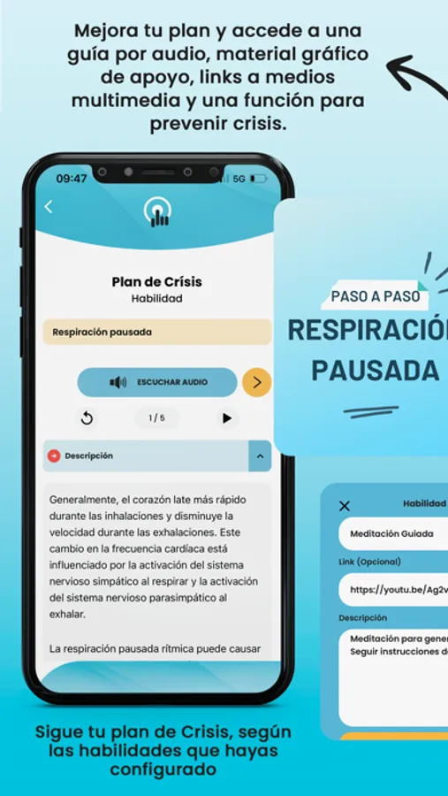 A través de DBT CRISIS podrás desarrollar un plan individualizado con distintas estrategias/habilidades para el manejo de las crisis, las que contarán con un “paso a paso” para guiarte en la aplicación efectiva de la habilidad. En el caso de suscribirte podrás contar con una guía de audio para el paso a paso de cada habilidad, lo que facilitará su aplicación de forma efectiva en el momento de crisis. Además, podrás contar con la función “Prevención de Crisis”, mediante la que podrás desarrollar una serie de recordatorios que te permitirán reconocer y chequear tu vulnerabilidad emocional, así como identificar y anticiparte a potenciales situaciones de crisis para evitar conductas que empeoren la situación.