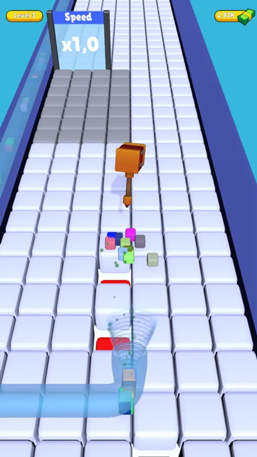 By breaking the cubes with the controlled hammer, the platform moves forward and the cubes are collected.