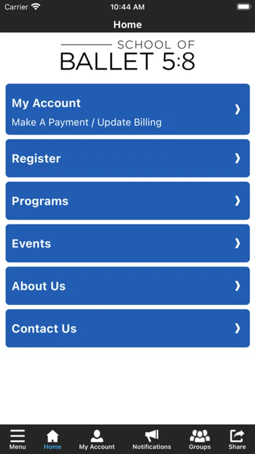 The School of Ballet 5:8 app allows you to manage your account with ease, register for classes, make payments, and access important dates and policies. You'll also receive important notifications about class changes, closings, registration openings, special announcements, and upcoming events.