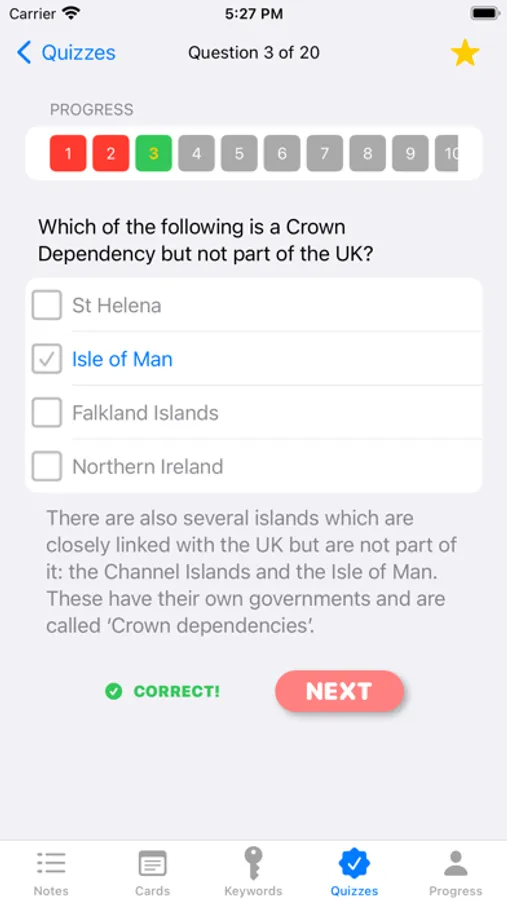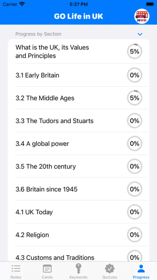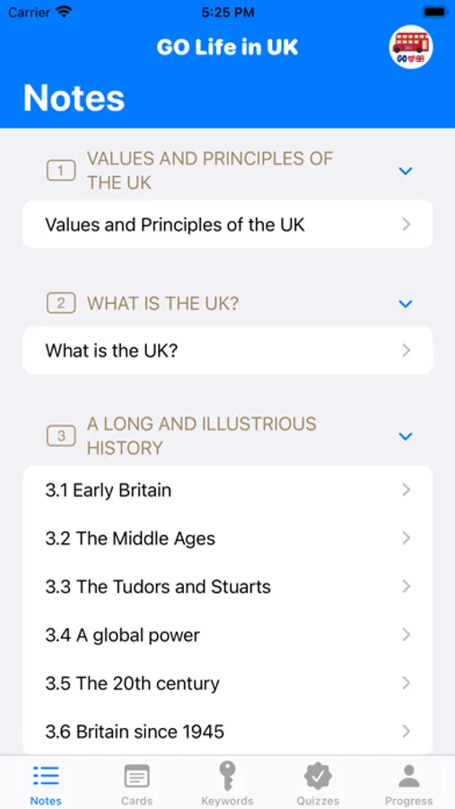 GO Life in the UK help you to prepare for the "Life in the UK" test and pass in first take. The summary notes with keywords highlights and study cards can help you to memorise what you need to pass. Final step is to take the Exam-alike quizzes either by chapter or random selection mode. The Progress section help you to keep track of the reviewed questions and your scores.