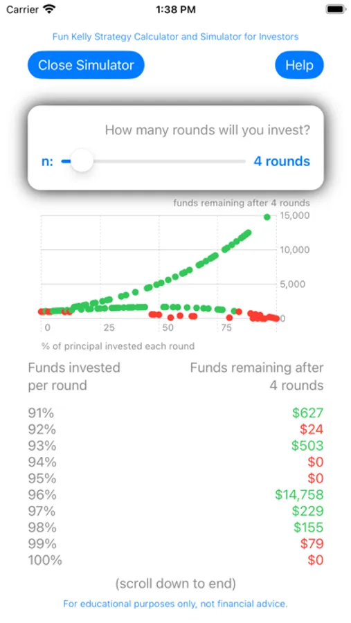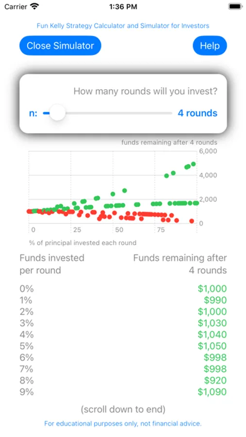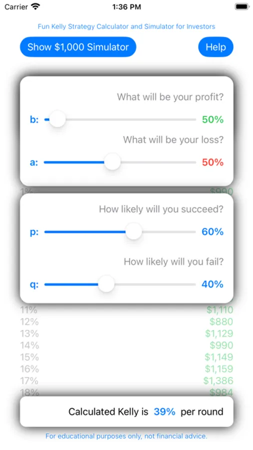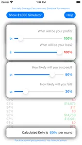 A fun and easy Kelly strategy calculator and investment simulator for everyday use. Made specifically for investors. Adjust the sliders to see automatically and quickly the optimal percentage to invest. Simulate up to 50 rounds of investing starting with $1000. Watch your funds grow. Quickly see if you you should play it safe or just walk away. Minimize your losses and maximize the longevity of your investment funds.