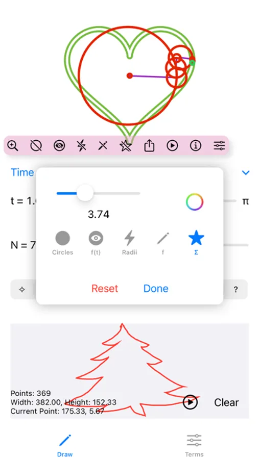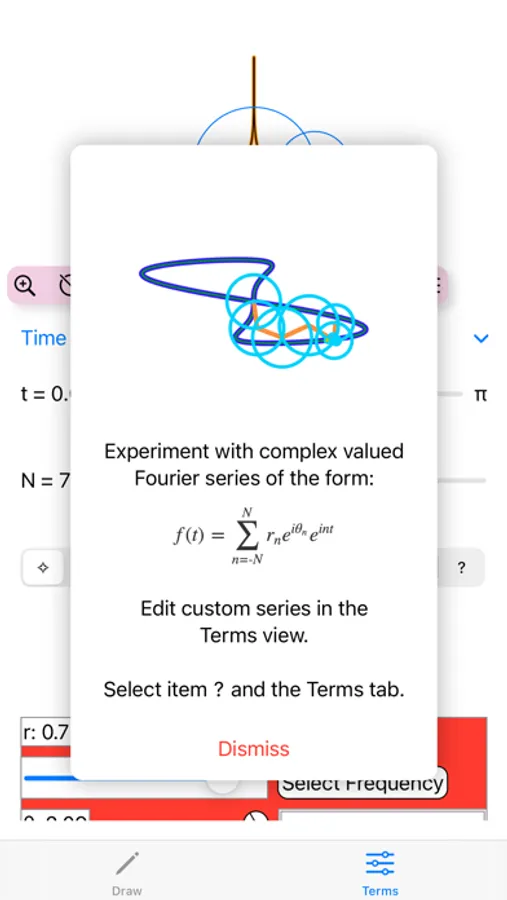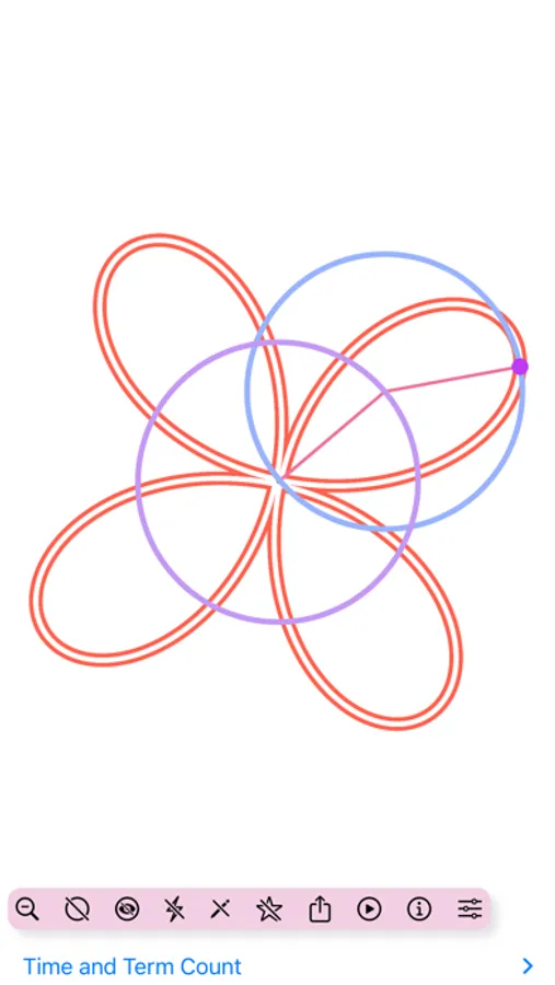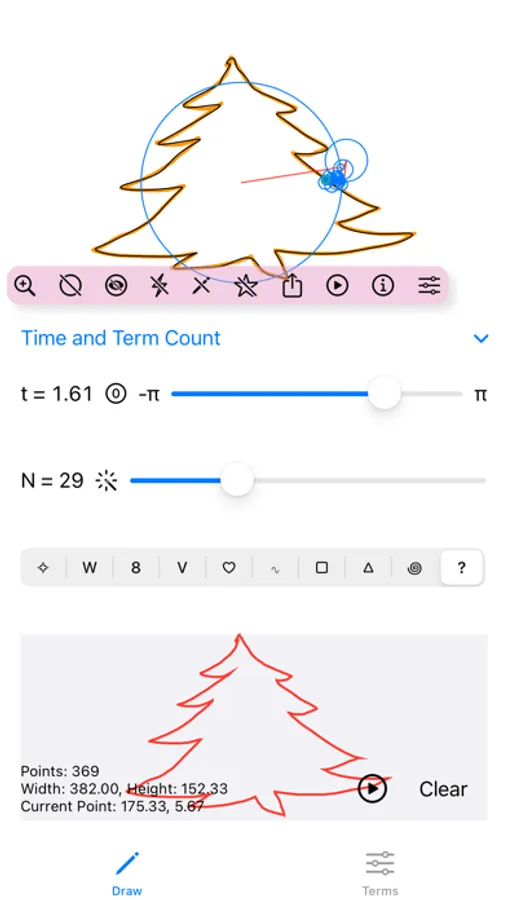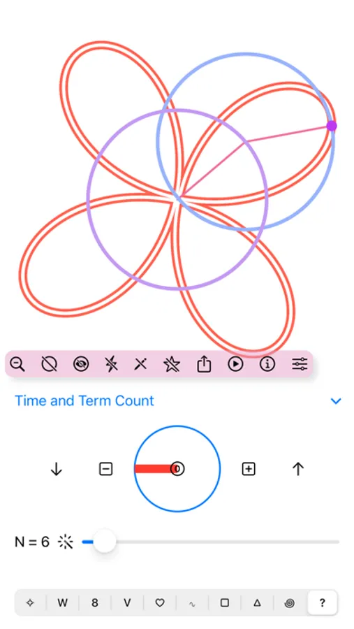 Use the segmented control to select from a variety of built-in 2D parametric curves or select the `?` item. Then you can either draw a 2D curve in the Draw tab view, or edit custom Fourier series terms in the Term tab view. In the latter case the app will numerically generate the Fourier series of a Fourier series, by sampling the summation of the series terms.