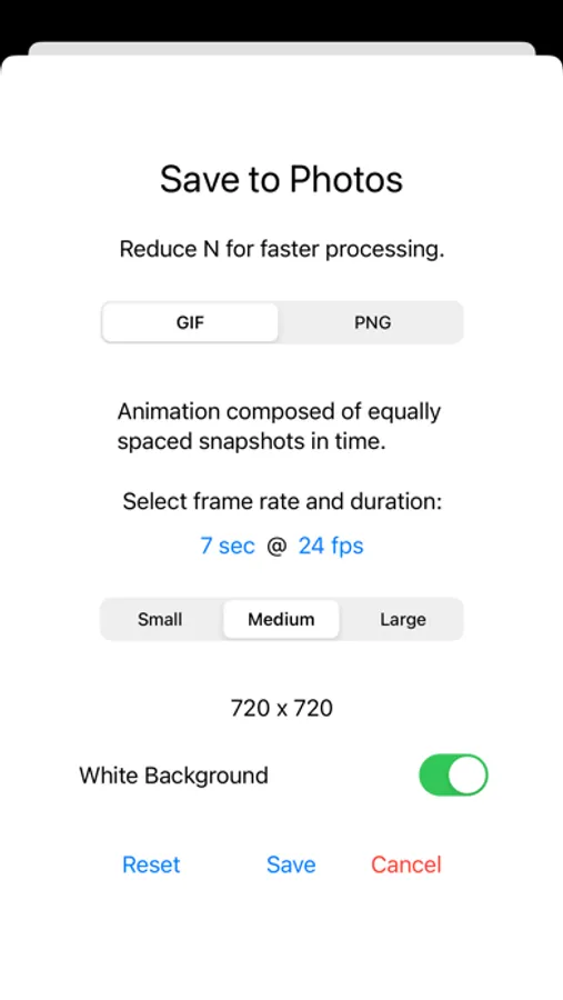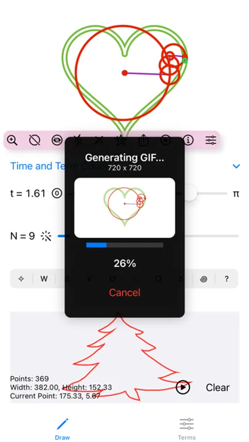 • Share: Save the graphic as an animated GIF or snapshot PNG in Photos library.