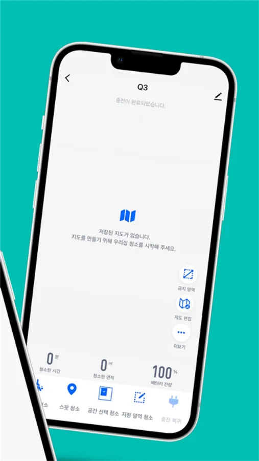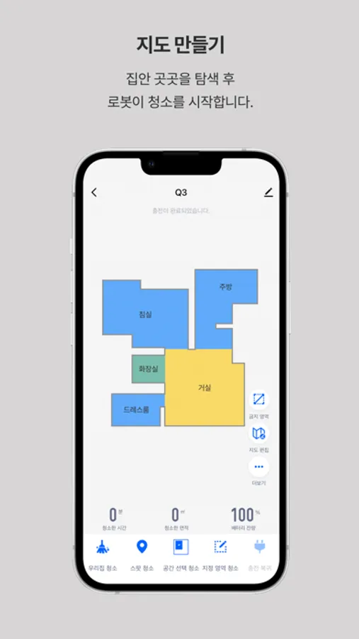 우리 집 청소 버튼을 누르면 로봇이 집안 곳곳을 돌아다니면서 지도를 그립니다. 지도가 생성되면 자동으로 공간을 구분하고 전체 공간 청소를 시작합니다.