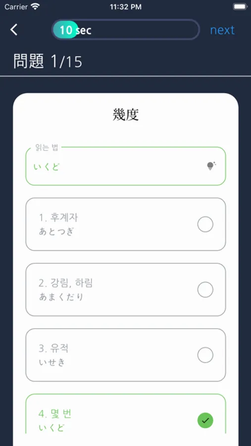 [단어의 의미 (사지선다형) + 단어의 읽는 법 (주관식)]