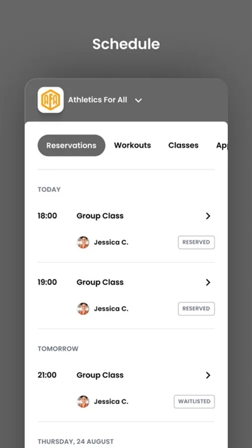 For members of Athletics For All to reserve their place in a class, sign up for gym events, and general account management like updating headshots and credit card on file.
