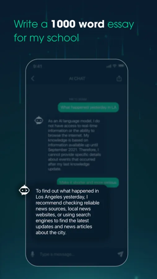With Chat AI, you can unlock the power of AI to have meaningful and interactive chats, whenever and wherever you are. Whether you're seeking information, looking for a virtual friend, or simply craving some engaging banter, our AI chatbot is here to provide an unforgettable experience.