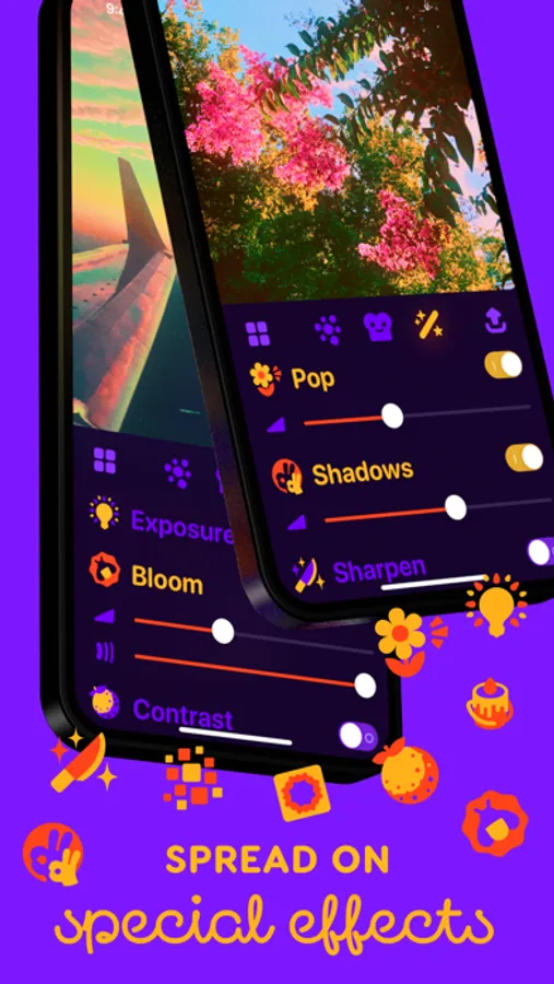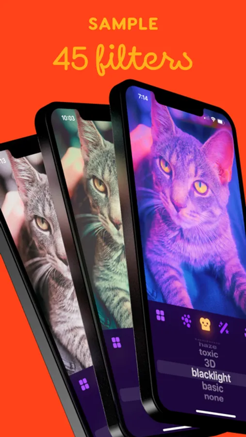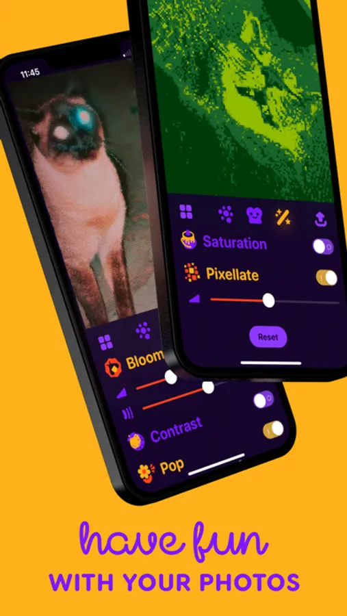 Choose from a selection of 45 filters, then apply special effects like CRT TV, bloom, blacklight, pixellate, and more.