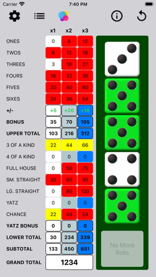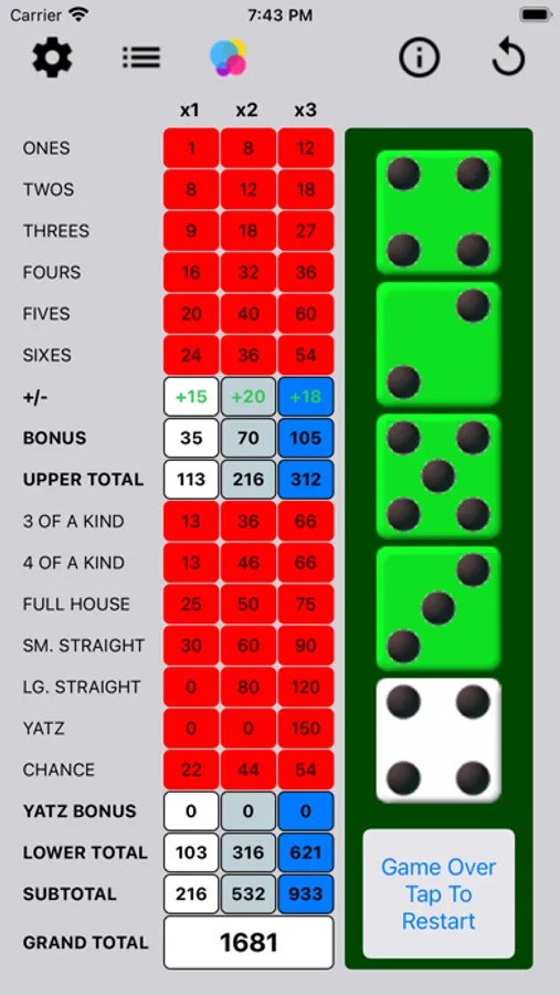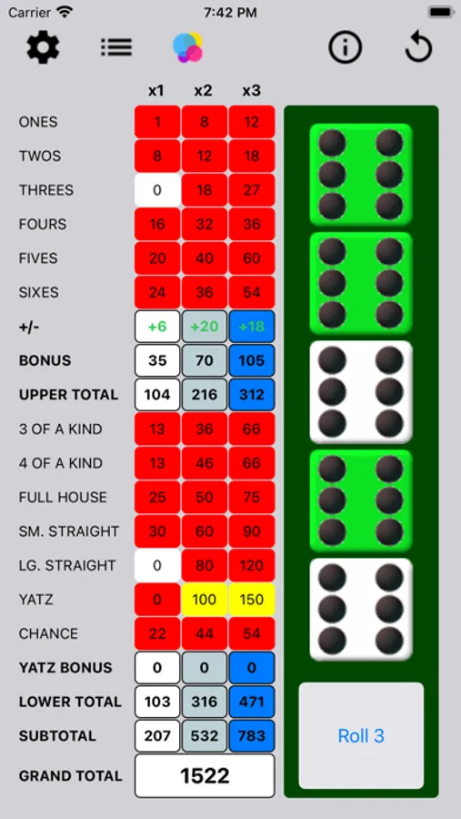Triple Yatz is similar to YAHTZEE* (aka Yatzy, Yaht & Yacht) except that there are three scoring columns for each game instead of the just one. Columns 2 & 3 multiply the category scores by 2x & 3x. Complete a game in 39 turns of up to 3 rolls & maximize your game total by strategically applying scores in the column where you'll get the best result.