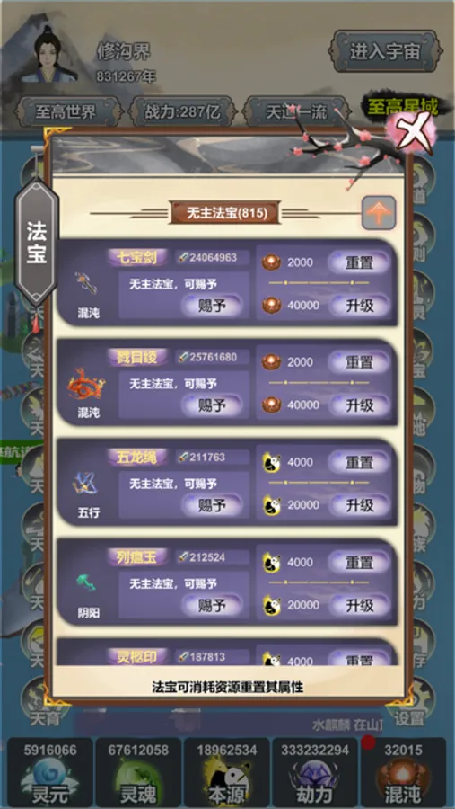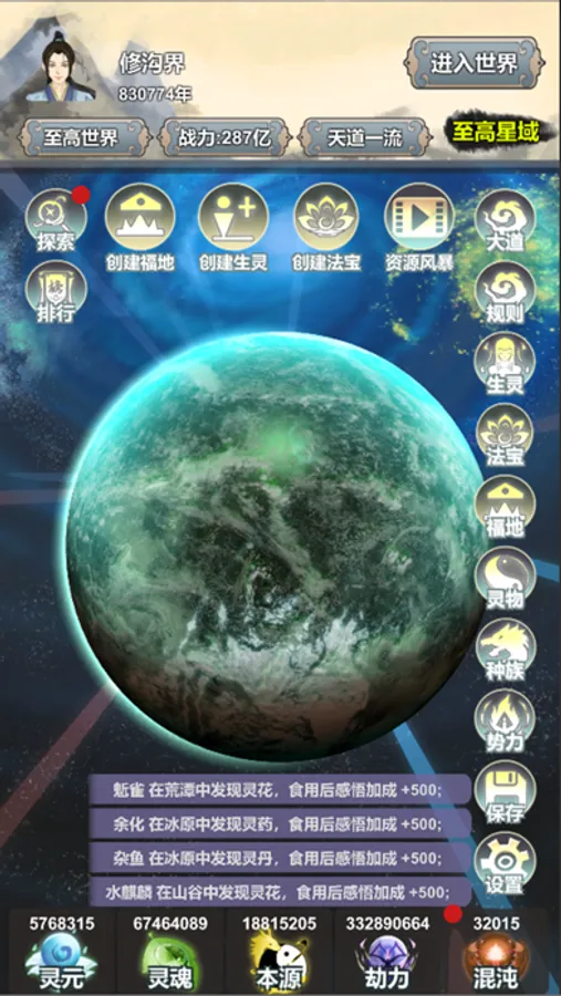 收集资源创建先天生灵、先天灵宝、洞天福地