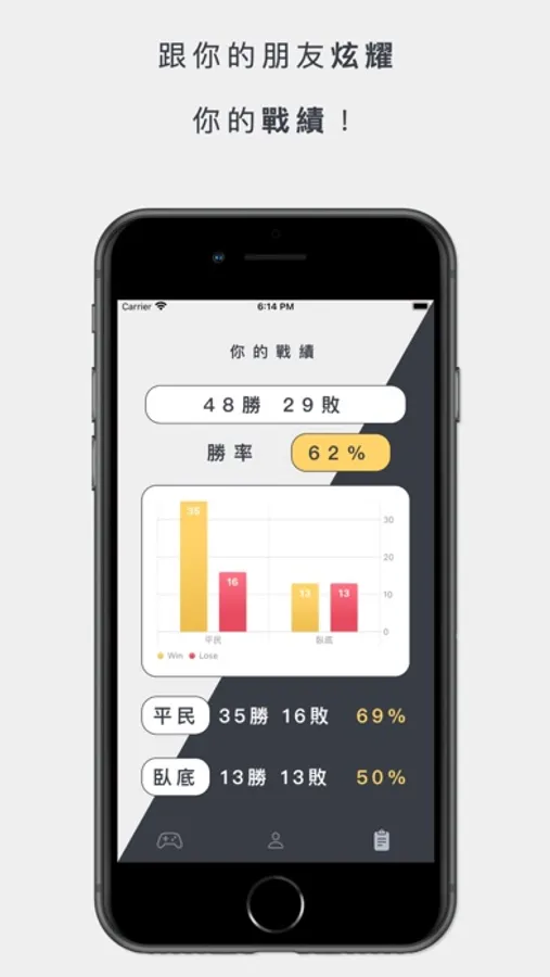 圖像化戰績圖表,分析你擅長當一位無害的平民,還是超會偽裝的臥底,但也有可能你是沒做什麼就常常被殺的可憐蟲!
