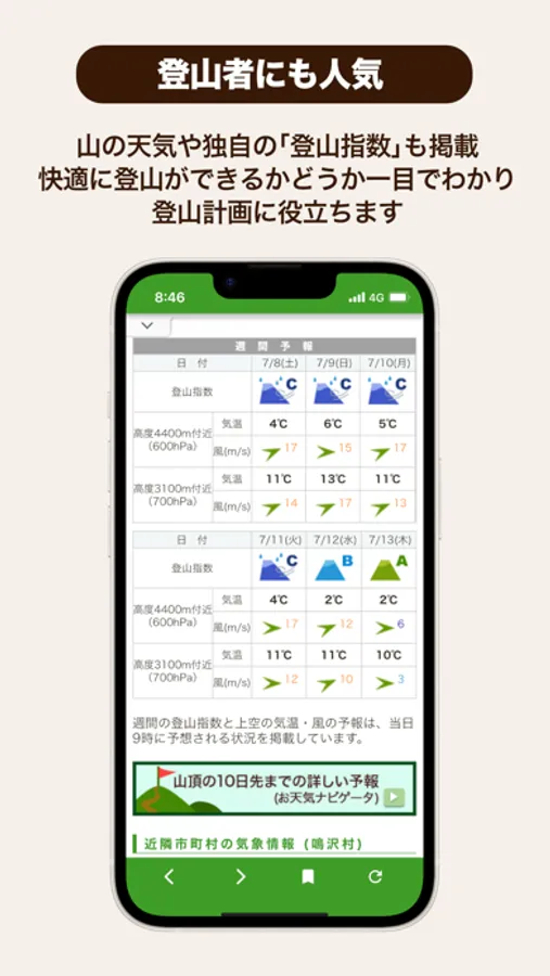 山の天気や登山の快適さがわかる「登山指数」も掲載しており、登山者の皆様にも多く使って頂いています。